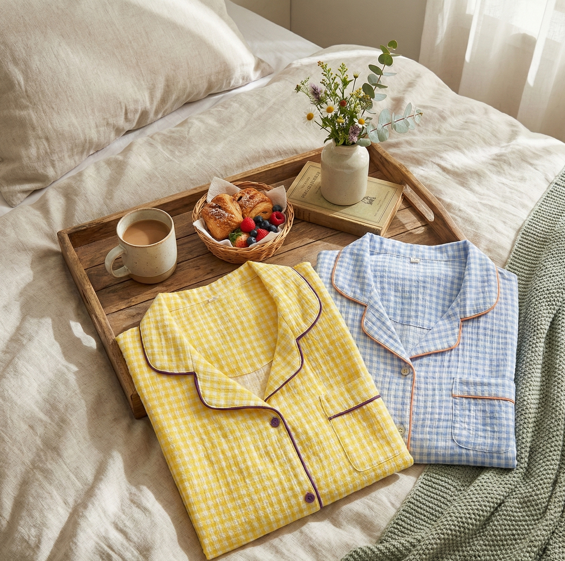 Ponadczasowy wzór w kratkę vichy nadaje tym piżamom niepowtarzalny, vintage'owy charakter. Kontrastowe lamówki w głębokich kolorach (bordowa na żółtej, bordowa na niebieskiej) podkreślają elegancję i dopracowanie każdego detalu. To piżamy, w których poczujesz się jak bohaterka ulubionego filmu z lat 50.